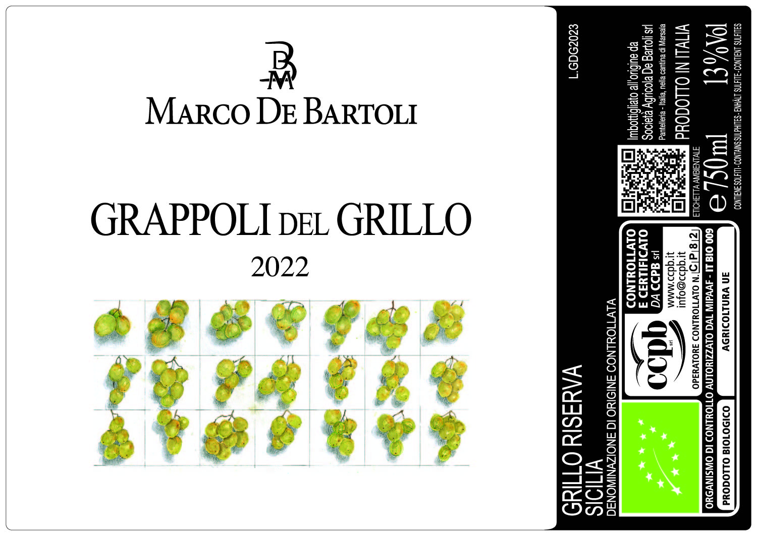Anche l’etichetta nasce da questa stessa intenzione. È Marco stesso a volere che il Grillo venga mostrato per ciò che è, nella sua forma più concreta. L’artista Carlo Lauricella traduce questa idea in una composizione che richiama le tavole ampelografiche: una sequenza di grappoli, osservati e ripetuti, quasi a costruire uno studio visivo del vitigno. Un gesto diretto: far vedere com’è fatto il Grillo, restituirgli riconoscibilità.